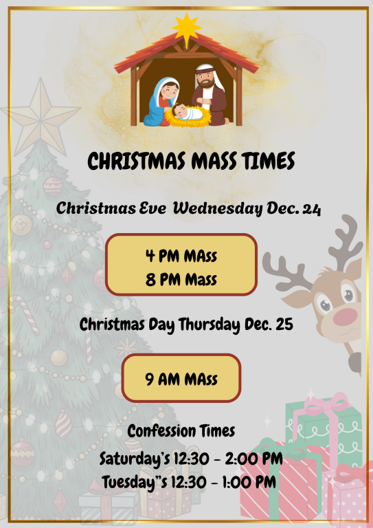 **PLEASE NOTE** There will only be one 4:00pm mass this year due to the Parish Hall serving as our Church!**